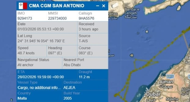 Vessels are turning back en masse: CMA CGM’s San Antonio u-turned while exiting the Persian Gulf (Credit: Screenshot from Pole Star Global PurpleTrac). Lars Jensen of Vespucci Maritime tracked five container ships reversing course on February 28, including three from CMA CGM, plus five others avoiding entry.